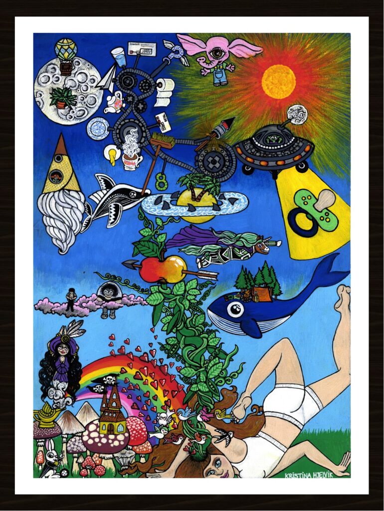 Hej, mit navn er Kristina Hjelvik og så længe jeg kan huske har jeg brugt kunst som er et udtryk for fantasiverdenen i mit hoved, som er fyldt med farver og magi. Mit liv har langt fra været standard og det kommer også til udtryk i min kunst.